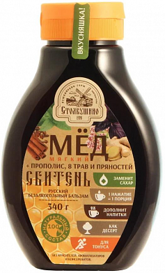 - Мягкий натуральный мед с прополисом, травами и пряностями, 340 г