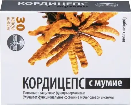Кордицепс с мумие грибная серия капсулы массой 450 мг - это биологически активная добавка к пище, содержащая в качестве действующих веществ экстракт гриба кордицепса, экстракт мумие. Кордицепс (гриб) обладает уникальным составом широкого спектра действия: способствует укреплению иммунитета и повышению жизненных сил и энергии, выведению шлаков, токсинов и свободных радикалов из организма, замедляя процесс старения, деградации клеток, стимулирует кровообращение, оказывая благотворное влияние на мочеполовую сферу. Мумие - это природный комплекс множества полезных органических и неорганических веществ, микро- и макроэлементов, значительно повышает устойчивость человеческого организма ко всем проявлениям и факторам окружающей среды. Рекомендуется взрослым по 2 капсуле 2 раза в день во время еды. Продолжительность приема - 1 месяц. Перед применением рекомендуется проконсультироваться с врачом.