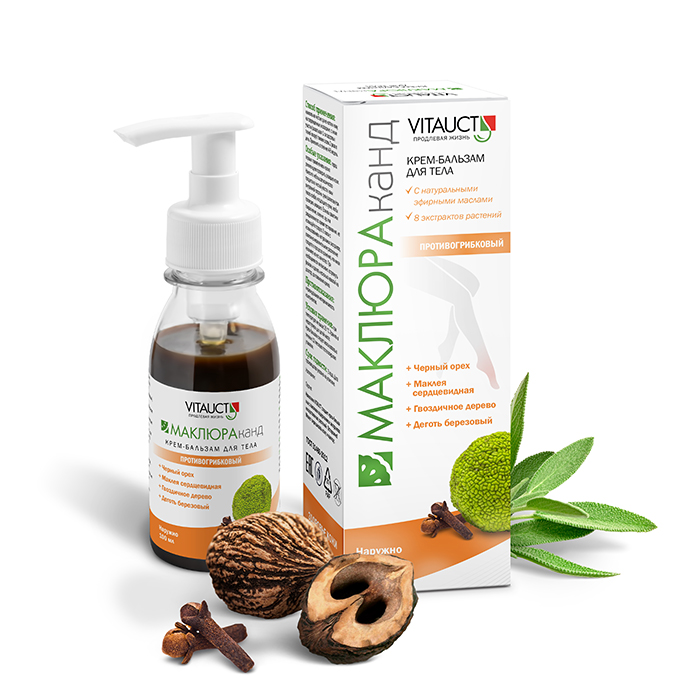 Плоды маклюры оранжевой – один из основных действующих компонентов крем-бальзама МАКЛЮРАканд, который содержит в своем составе аминокислоты, флавоноиды, фитостерины, сапонины, дубильные вещества, витамины и микроэлементы. Маклюра заживляет поврежденные участки кожного покрова, а биологически активные соединения растения губительно отразятся на грибке и помогут остановить его дальнейшее распространение.Орех черный обладает противогрибковым действием, применяется в лечении различных микозов. Доказано, что юглон в составе растения вырабатывает кислородсодержащие свободные радикалы и действует против широкого спектра возбудителей грибковой инфекции различной локализации.