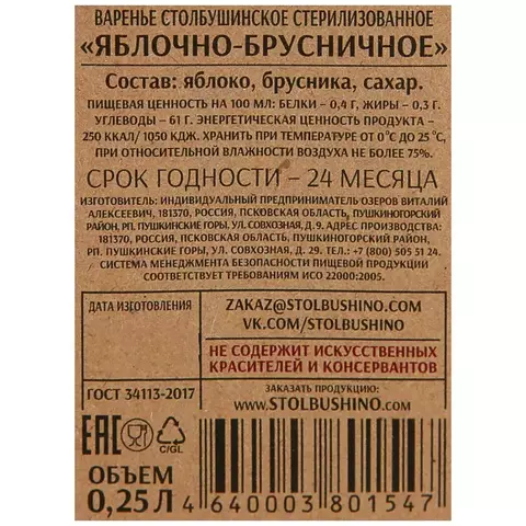 - Варенье Столбушинское стерилизованное "Яблочно-брусничное".